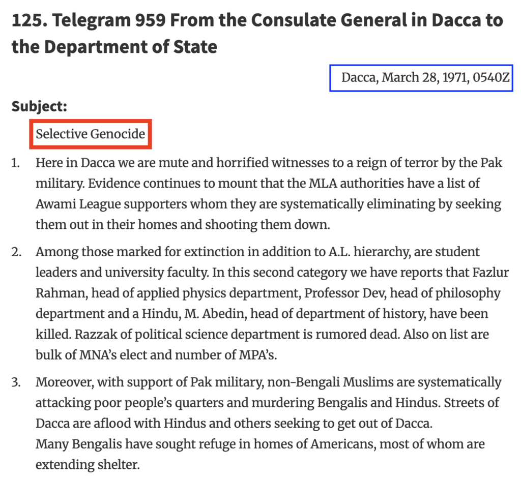 - Diplomatic cables and eyewitness reports from March–April 1971 describe “selective genocide,” “reign of terror,” and the use of lists to hunt people down.
